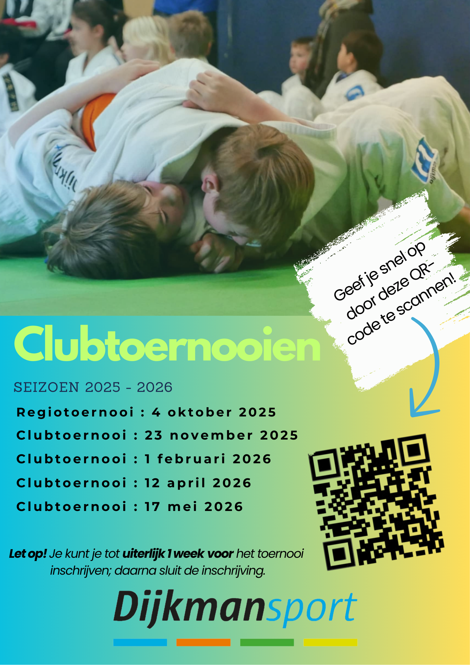 De clubtoernooien bij Dijkmansport zijn leuke toernooitjes die gericht zijn op leren. Ze zijn daarom zeer geschikt voor beginnende judoka’s en judoka’s die niet zo vaak aan wedstrijdjes meedoen. Alle clubtoernooien vinden plaats op de zondagmiddag.